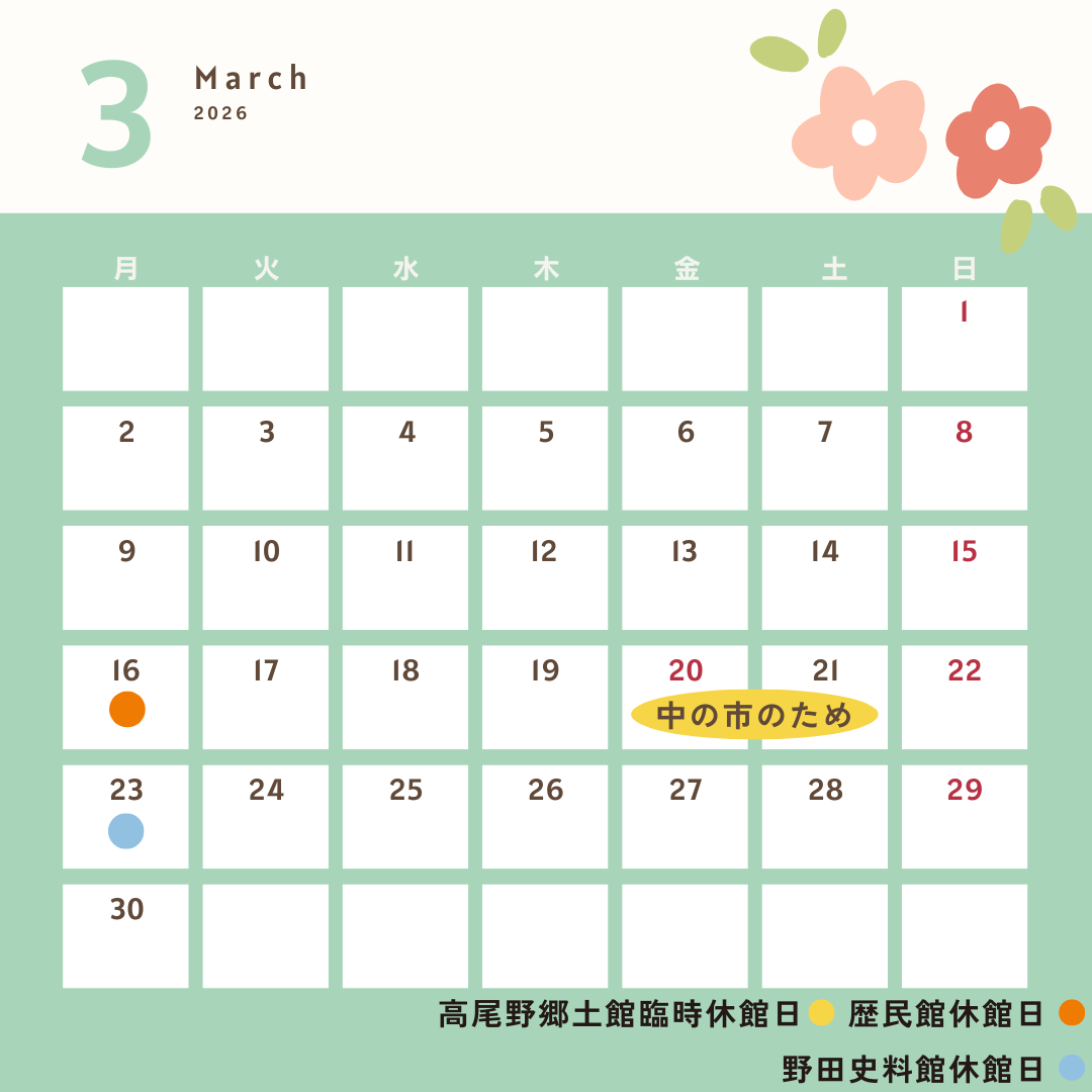 また、定期休館日の3月23日(月)は臨時開館いたします。