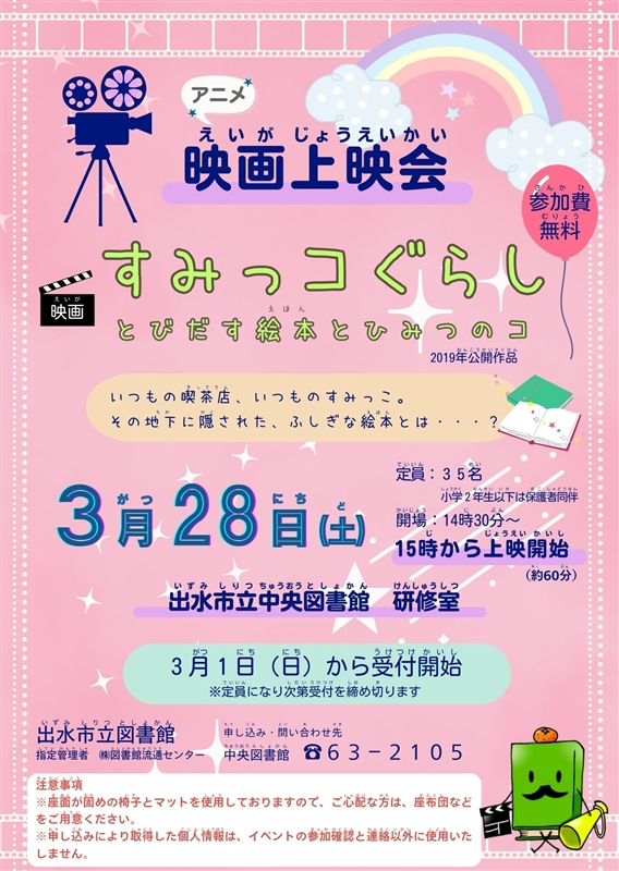 令和8年3月28日(土)に映画上映会を開催します。小さなお子さんから大人のひとまで、お気軽にお申込みください。