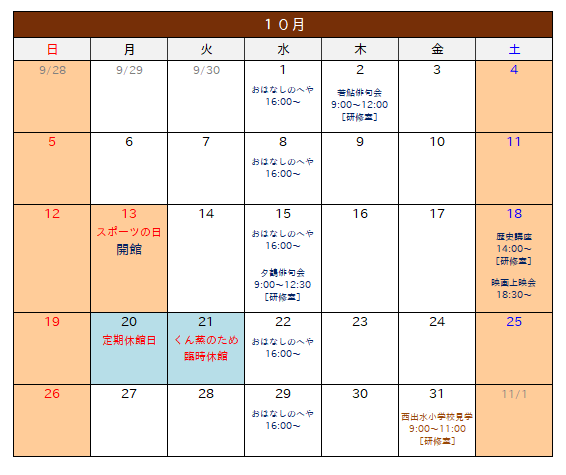 20日 〘館内くん蒸実施のため臨時休館〙 21日 |