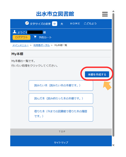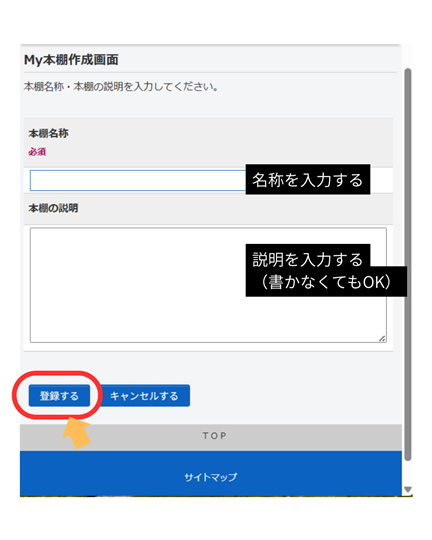 ②My本棚作成画面で、本棚名称・本棚の説明を入力して、【登録する】ボタンをクリックします。