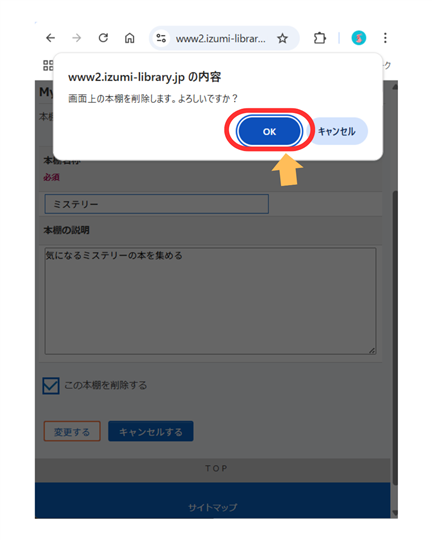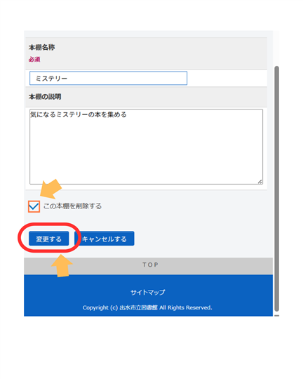 ④本棚を削除したい場合は、 ☐この本棚を削除する に✓をつけて【変更する】ボタンをクリックします。