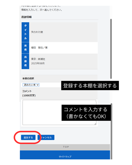 ②本棚の選択やコメントの入力を行い、 【追加する】ボタンを選択します。