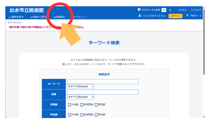 下の画面のとおり、画面上部の「▼利用照会」をクリック